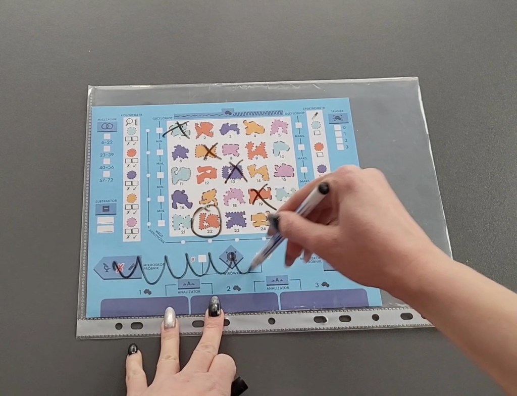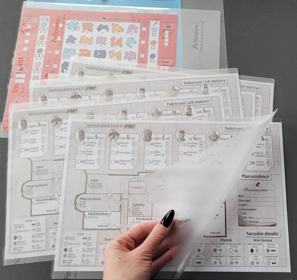 Jest to preferowana przez mnie opcja. Wyrwaną z bloczku kartę wkłądamy do folii do laminowania i przepuszczamy przez laminator. W zależności od grubości folii otrzymamy różną sztywność. Następnie trzeba przyciąć nadmiar folii, by plansza zmieściła się do pudełka. Sugeruję też zaokrąglić rogi – mogą być bardzo ostre. Tak jak w opcji 1 potrzebny jest już tylko marker suchościeralny.