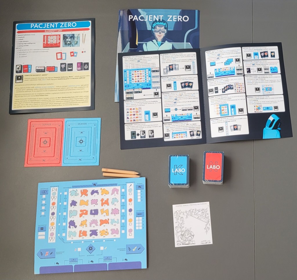 W pudełku znajdziemy też 2 małe ołówki i bloczek 50 dwustronnych kart laboratoriów – czerwonego i niebieskiego. Gdy się skończą można je pobrać ze strony wydawcy jako plik pdf do wydruku, niestety jedynie w pełni kolorowej wersji. Osobiście chciałabym mieć też opcję pliku z białymi tłami kart zamiast kolorów laboratoriów. Całe szczęście karty z bloczka można przerobić na wielorazowe. Jak – możecie przeczytać tutaj.