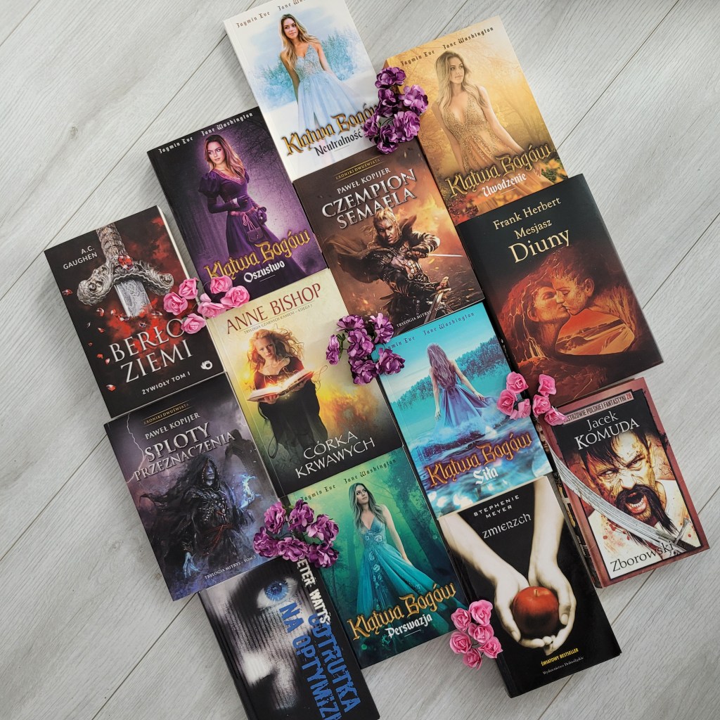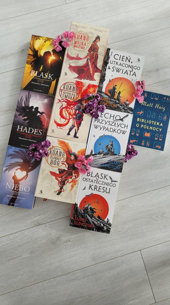 Kwiecień był też udanym zakupowo miesiącem. Udało mi się dorwać, niestety używany, ale jednak, pierwszy tom „Trylogii Licaniusa” Jamesa Islingtona, a więc kupiłam też kolejne dwa. Zamówiłam również „Trylogię wojen makowych” Rebecci F. Kuang, trylogię „Blask” Alexandry Adornetto oraz „Bibliotekę o północy” Matta Haiga.
