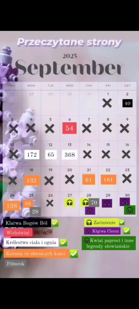 Na sam koniec miesiąca przypomniałam sobie również o audiobookach. Przesłuchałam „Klątwę cierni”, którą miałam w Empikowym koszyku czekającą na zakup oraz zaczęłam „Kwat paproci i inne legendy słowiańskie”.
