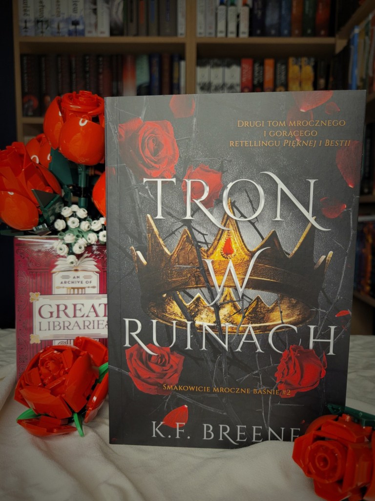 „Tron w ruinach” skupia się na rozwijającej się relacji tej dwójki, a jednocześnie przygotowuje nas na kolejny etap historii czyli poznanie króla demonów. Romans gra pierwsze skrzypce i jest to „smutaśny” romans. Zdecydowanie nie brakuje tam gorących scen seksu, ale w przeciwieństwie do pierwszego tomu, nie są one tak koszmarnie wulgarne i nie miałam ochoty wydrapać sobie oczu. Jedyne na co nie miałam ochoty to na odłożenie książki.